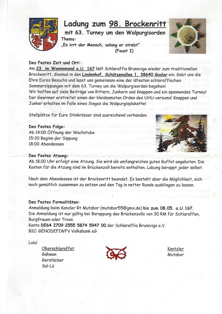 Der 97. Brockenritt mit 62. Turney um den Walpurgisorden in Goslar war wieder ein schönes Ereignis! Die Brunsviga wurde wieder ausgezeichnet unterstützt durch die Kaiserpfalz (390) und dankt dafür herzlich!